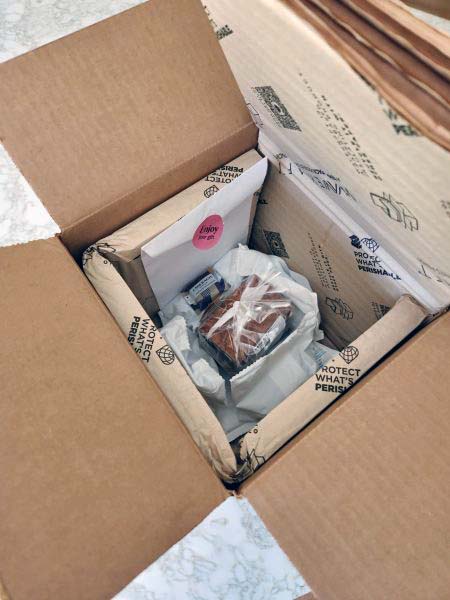 After I opened it, Ted showed me how it had arrived. The lumpy white things are cooling packs; the inner lining of the box is insulation to keep the bag in the center from melting. Ted said it was still cool when it arrived today.