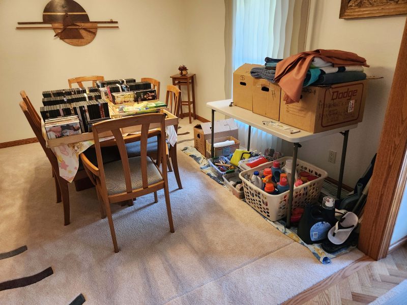 The laundry room was the last room to update in our house. We started in the usual way: empty the room and put everything in the dining room. When carpenters are working at our house, we always park our cars on the street so they can put their tool-filled trucks and their saws in the driveway. They store the supplies–and, this time, our washer and dryer–in the garage.