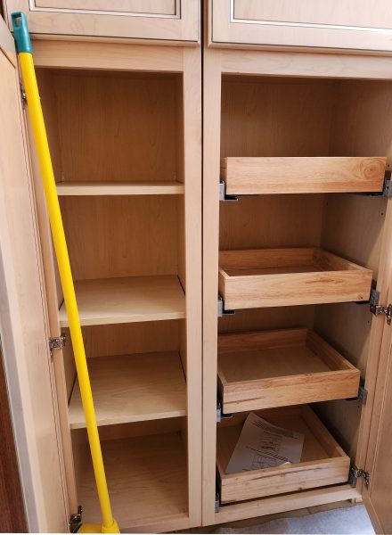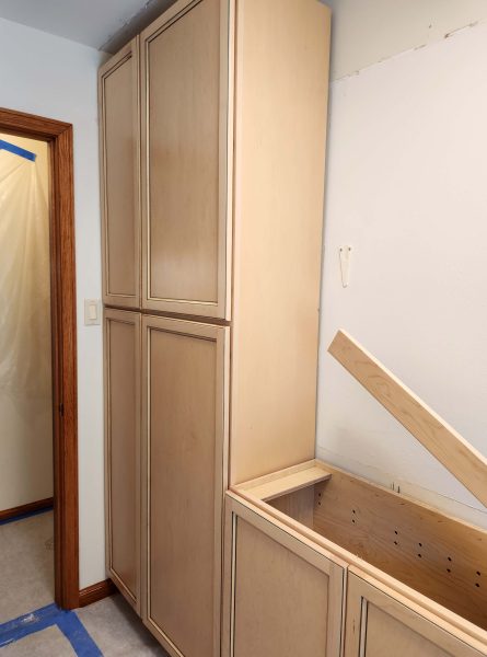 The left cabinet was 6-8 inches too short for brooms. (The broom is standing on the floor, not inside the cabinet.) Then we found out that manufacturers are moving away from customized cabinets. Really? It wasn’t a problem ordering our 1999 kitchen and laundry cabinets to size, nor was it a problem to order our 2023 kitchen cabinets to size within a 3-inch range (30, 33, 36 inches, etc.). Could it be that this particular manufacturer did not build custom-sized cabinets?
