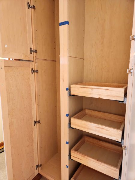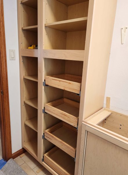 And now, the challenge. First, wait for the three additional drawers that needed to be ordered. When the drawers arrived, the master carpenter worked to customize these so-called “utility” cabinets. The process sounds simple, but doing the job well to make it as attractive as possible took time. The carpenter started by cutting out the horizontal shelving between the upper and lower cabinets. You can see the grooves in the side panels where the installed shelves used to be and the now-flush vertical scar in front of the left groove between the installed door hinges. This is where he cut out the wide board that crossed the shelf.
