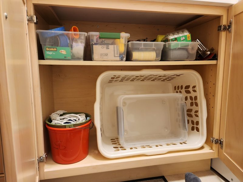 Ted and I don’t place our shelves evenly in our cabinets; we adjust the shelves according to what we store on each one. One or three sets of holes per cabinet was not good. Fortunately, the carpenters had a template they could use to drill holes any size and any distance apart, as desired, for shelf brackets. Go for it, guys! Now my laundry basket fits in the cabinet. Problem solved. If you zoom in, you can see the set of three holes inside at the right front of the cabinet and the strip of closer holes behind them. Note: the second plastic box from the left on the upper shelf is my “essential” toolbox.