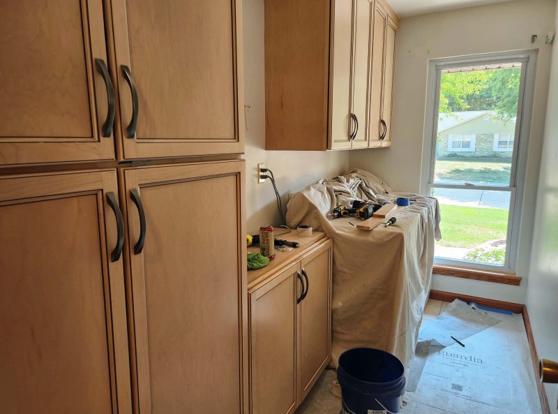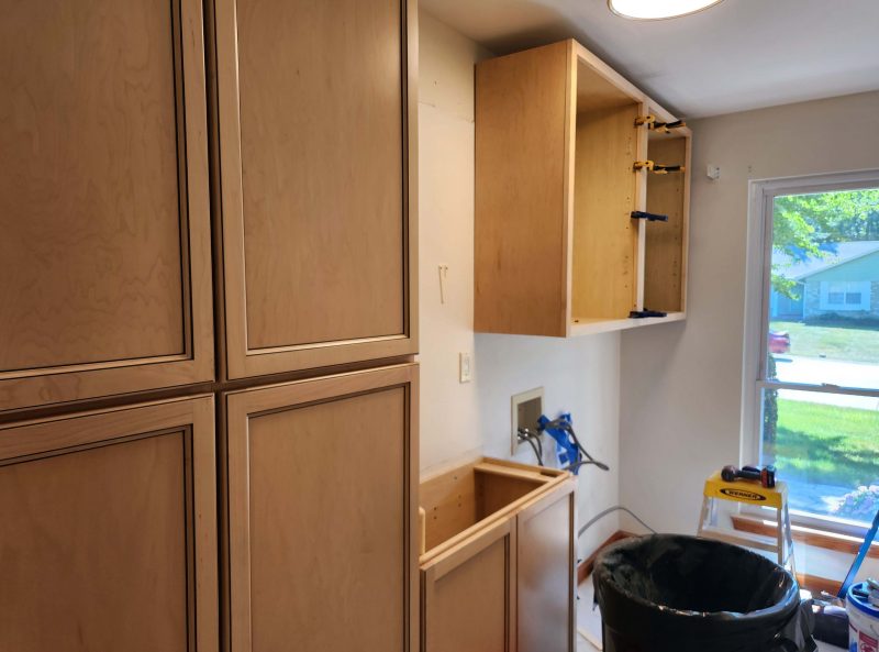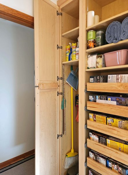 This is what our old utility cabinets looked like. One side provided storage for brooms, mops, etc.; the other side had eight drawers, most of which were filled with DVDs. We made it clear during the design process that we wanted the same design in the new cabinets, but . . .