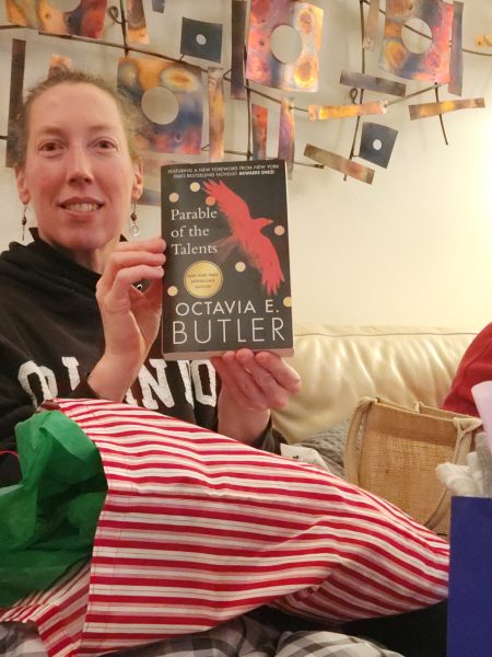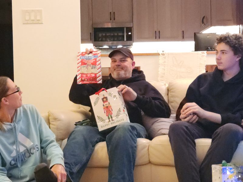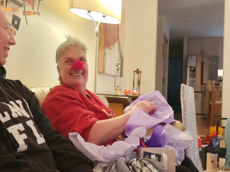 Annette’s birthday was in September and Ted’s birthday was in December. Due to unforeseen circumstances, we haven’t all been together since September, so we started the gift exchange with the celebrants opening their belated birthday gifts. Here’s Annette, opening one of hers.