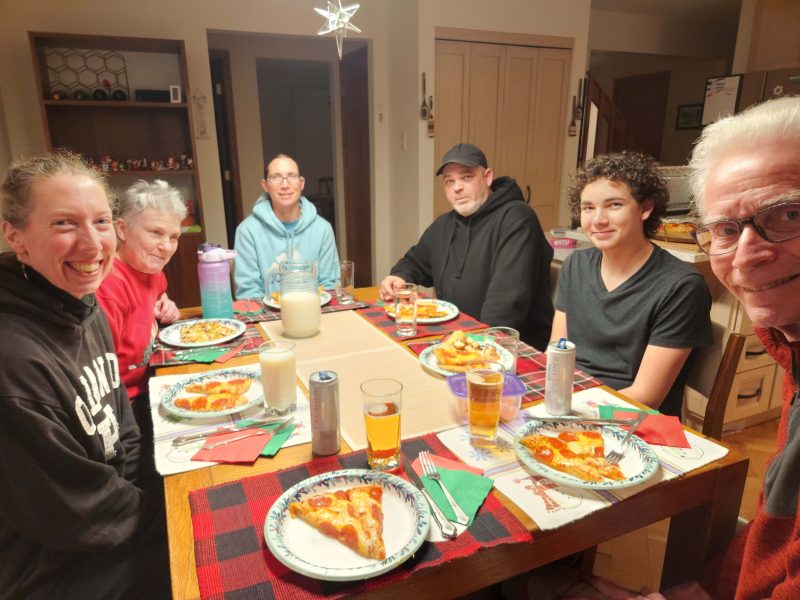 We kept dinner simple. Theo works at a locally owned pizza restaurant, so he helped Kari and me prepare pizzas for dinner. We all like pizza, and it was an easy meal, with Christmas candy and cookies for snacks and dessert.