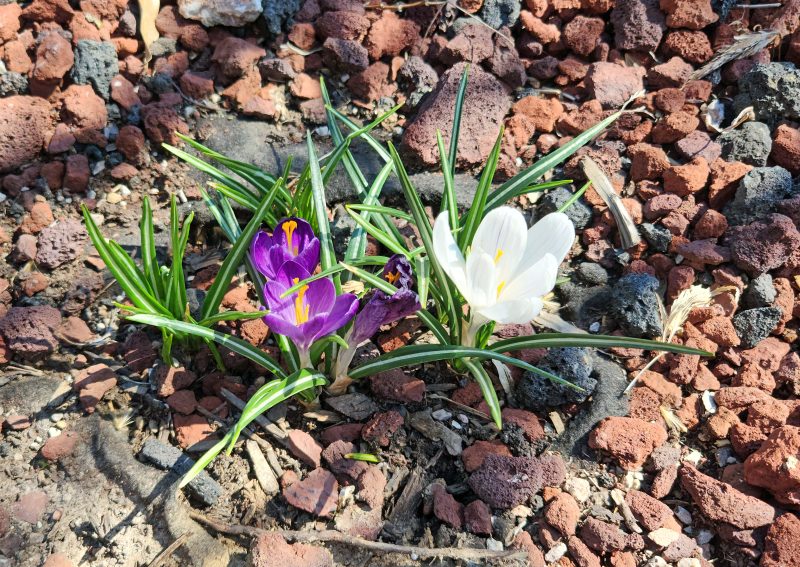 Years ago, we had some crocuses at the front door. I loved them, because they were the first announcement of spring, blooming in February, often while there was still snow on the ground. Last fall, Ted planted some more crocuses for me. They weren’t eager to come out into the cold to start growing, so the daffodils bloomed before the crocuses. We had a few blooms, and I thoroughly enjoyed them. I hope we have more next year.
