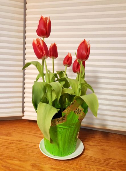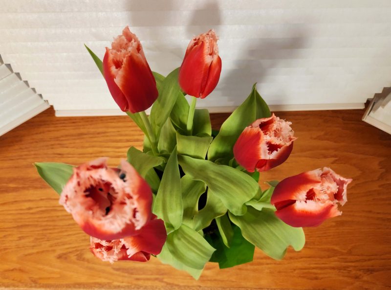 Every spring, when the forced bulbs appear in the grocery stores, Ted buys me a pot of spring flowers. This year, it was red/white tulips.